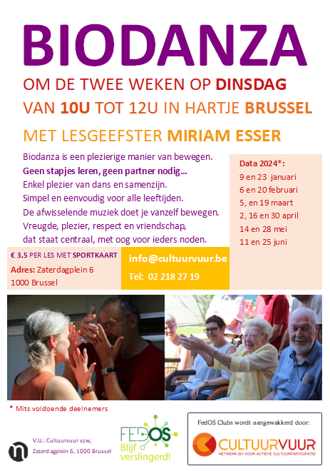 Klankbordgroep Gekleurde Wijsheid: Verschillende bijéénkomsten met een diverse groep Brusselse ouderen waarmee we samen nadenken, brainstormen, co-creëren rond sociale, culturele, welzijns- en zorgthema’s die leven bij ouderen in Brussel. Meer info bij Anne-Mie Misplon, medewerker Diversiteit en Inclusie CultuurVuur vzw: annemiemisplon@cultuurvuur.be
