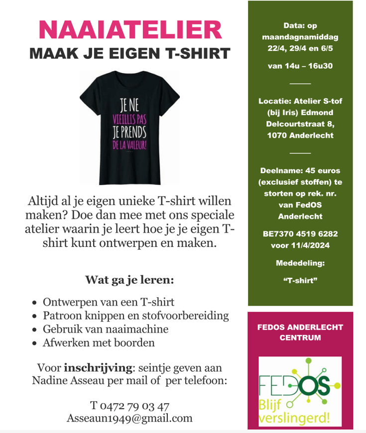Atelier “Maak je t-shirt” op 22/4, 29/4 en 6/5 van 14u00 – 16u30, naai-atelier bij Iris s-tof, Edmond Delcourtstraat 8 te Anderlecht. Meer info bij Voorzitster Brussel Hoofdstedelijk Gewest: Nadine Asseau, asseaun1949@gmail.com , T 0472 79 03 47