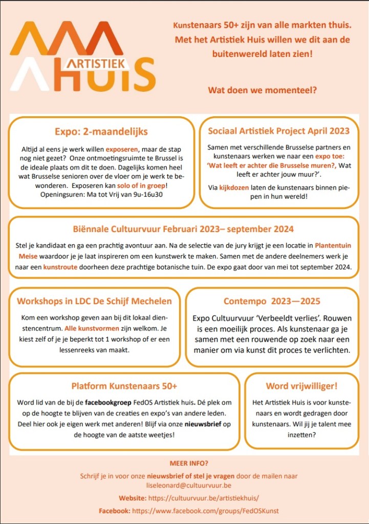Beschrijving: FedOS Kunstplatform +50 / Artistiek Huis verzamelt kunstenaars +50 die nieuwe technieken willen leren. Aan de hand van workshops scholen ze zichzelf bij. Ook 50-plussers die hun kunstzinnig talent nog moeten ontdekken zijn van harte welkom. Al deze workshops worden tevens door 50-plussers gegeven.