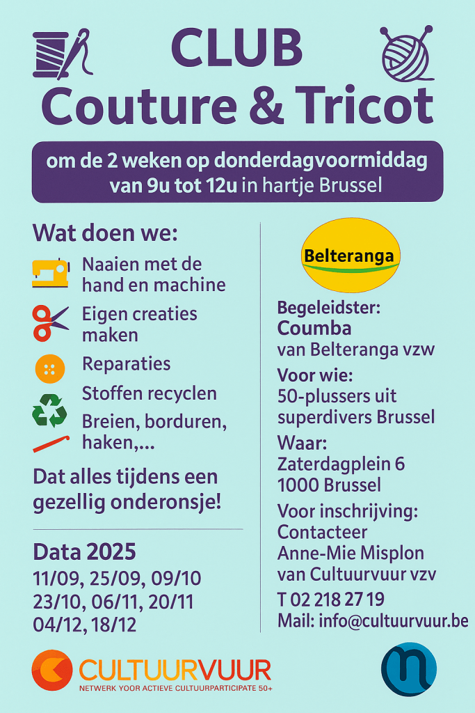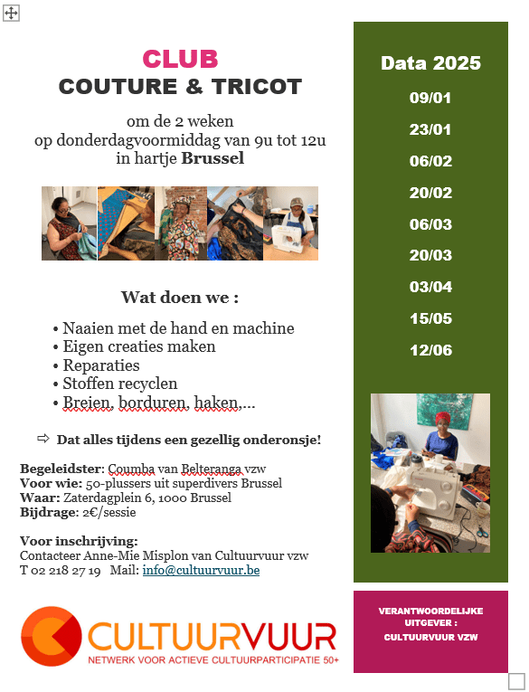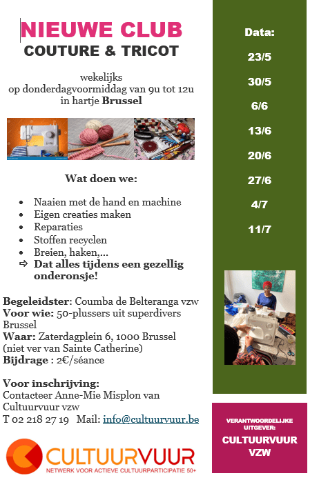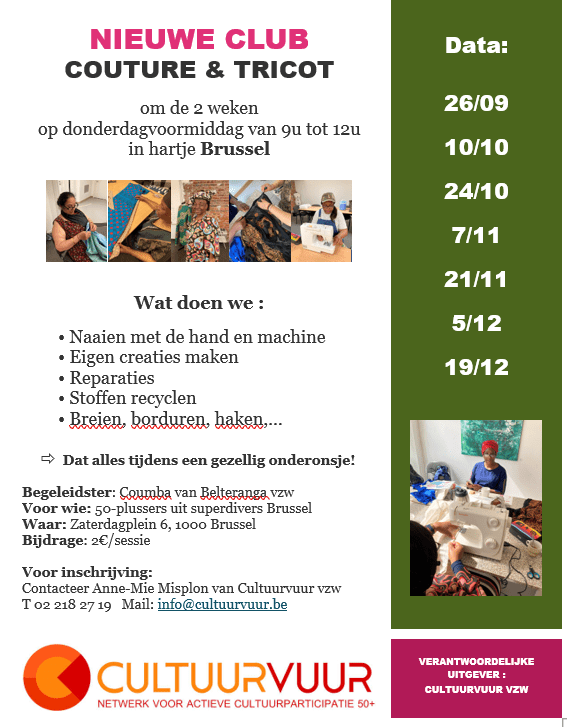 De nieuwe Cultuurvuur Club “Couture & Tricot” in actie. Heb je ook zin om te naaien, te breien, te borduren,… in een gezellige ambiance in hartje Brussel. Neem dan contact op met ons: T 02 218 27 19 of mail: info@cultuurvuur.be