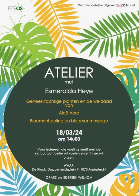 Maandag 18/03/24 om 14u00: “Atelier met Esmeralda Heye”. Geneeskrachtige planten en de weldaad van Aloë Vera. Bloemenhealing en bloemenmassage. Voor iedereen die voeling heeft met onze natuur en zich beter wil voelen en er frisser wil uitzien. Waar: De Rinck, Dapperheidsplein 7, 1070 Anderlecht.