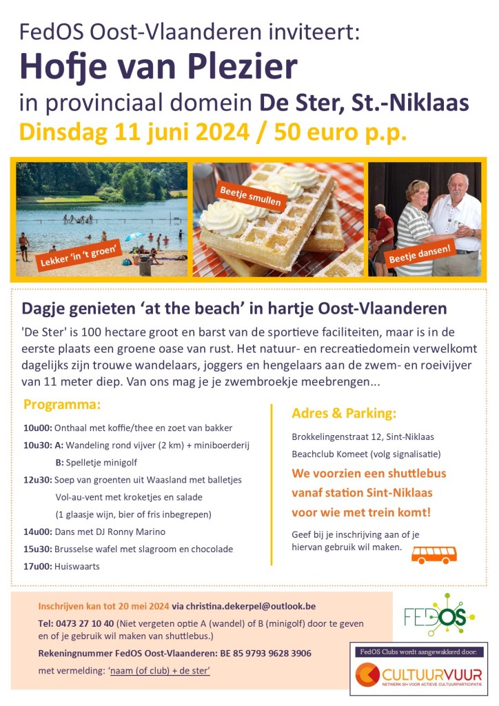 Dinsdag 11 juni 2024 Hofje van Plezier – Domein De Sterre te Sint-Niklaas. Gevarieerd programma waar bewegen centraal staat. Er wordt vanuit Brussel een bus ingelegd met verschillende stopplaatsen voor de leden van de Brussels clubs.